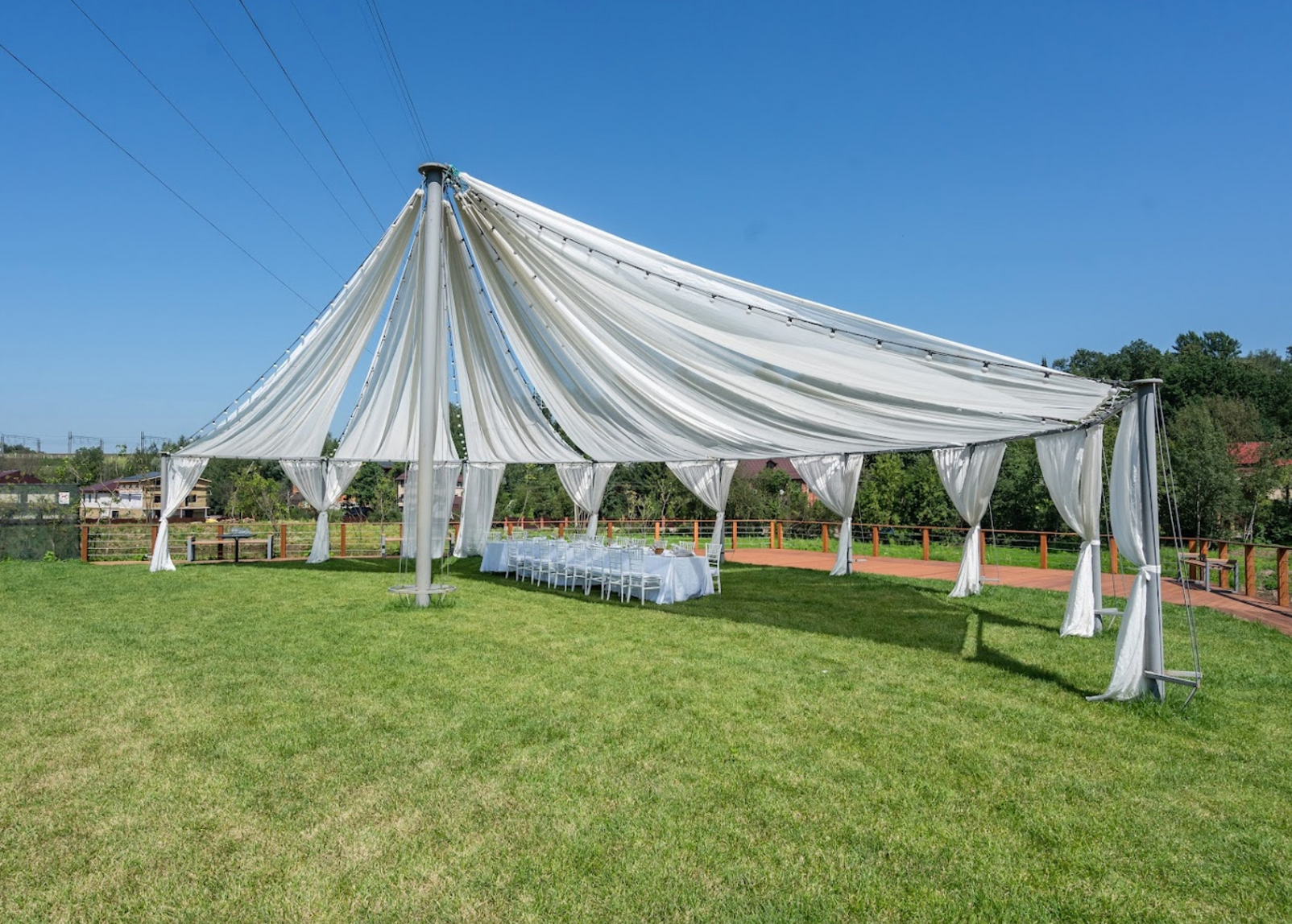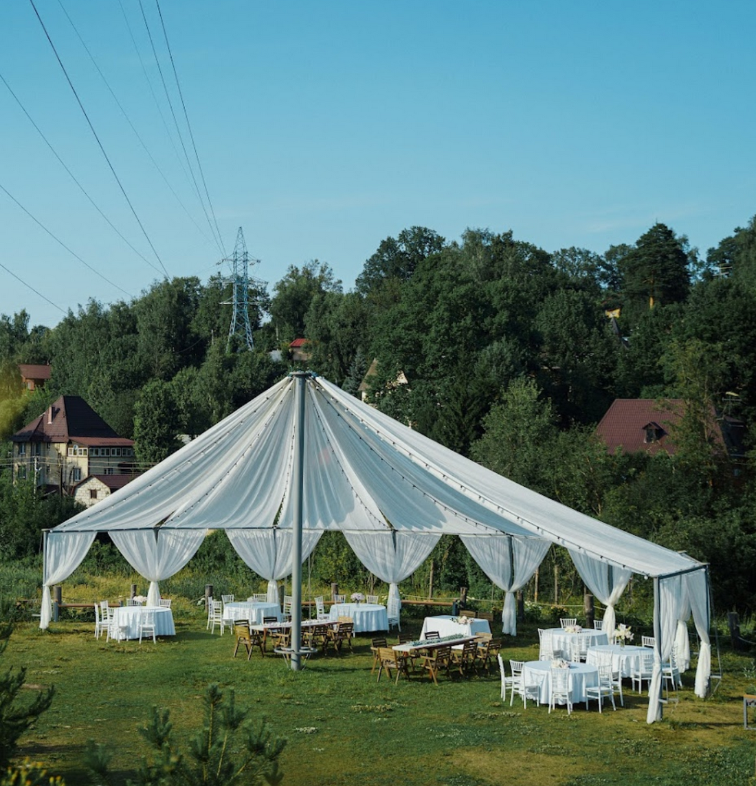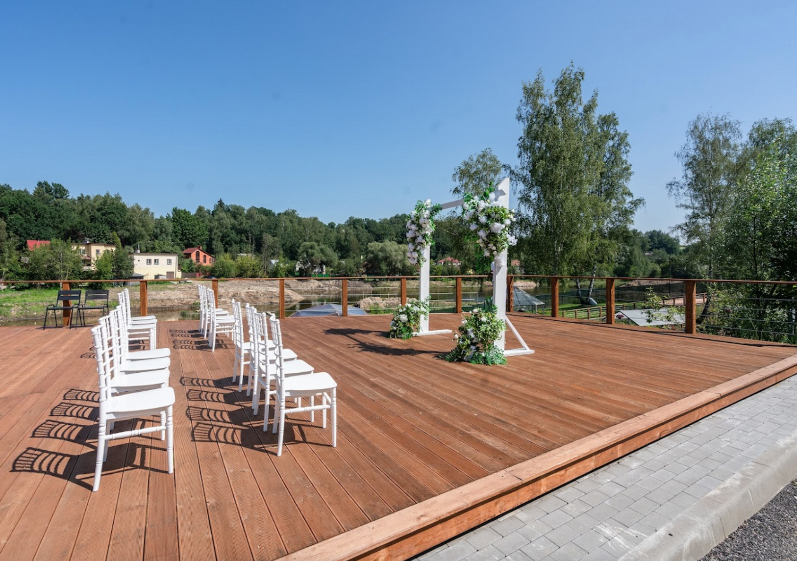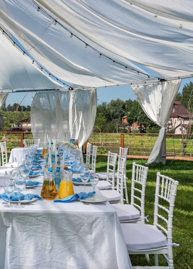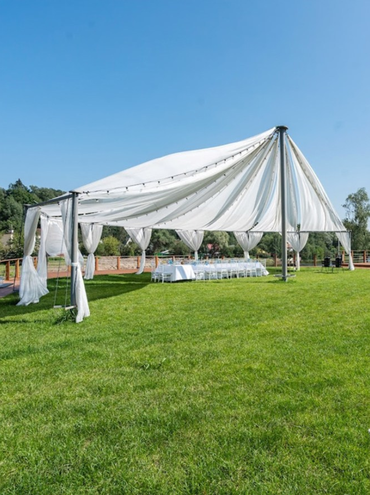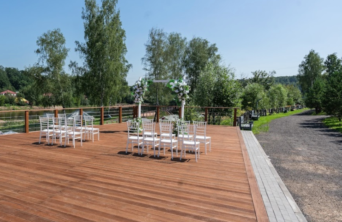 Открытый шатёр, номерной фонд, река, бассейн, большая территория для фотосессии.