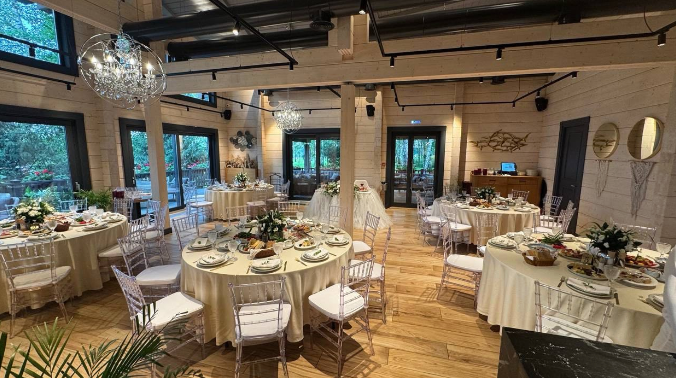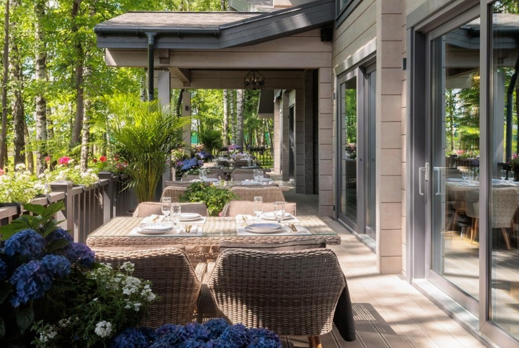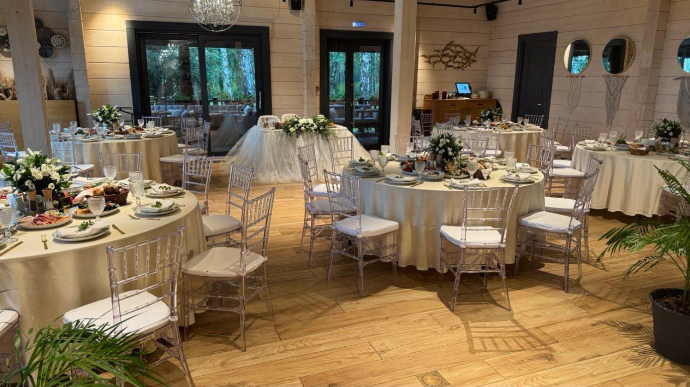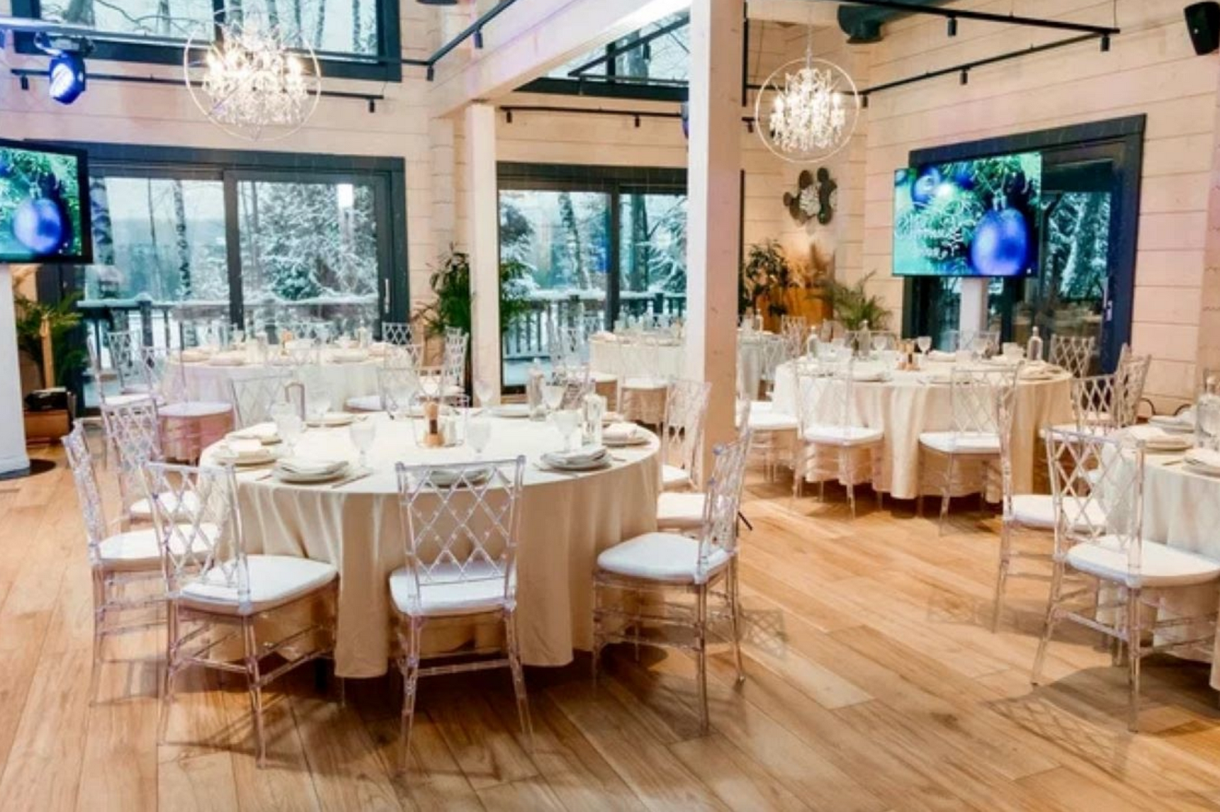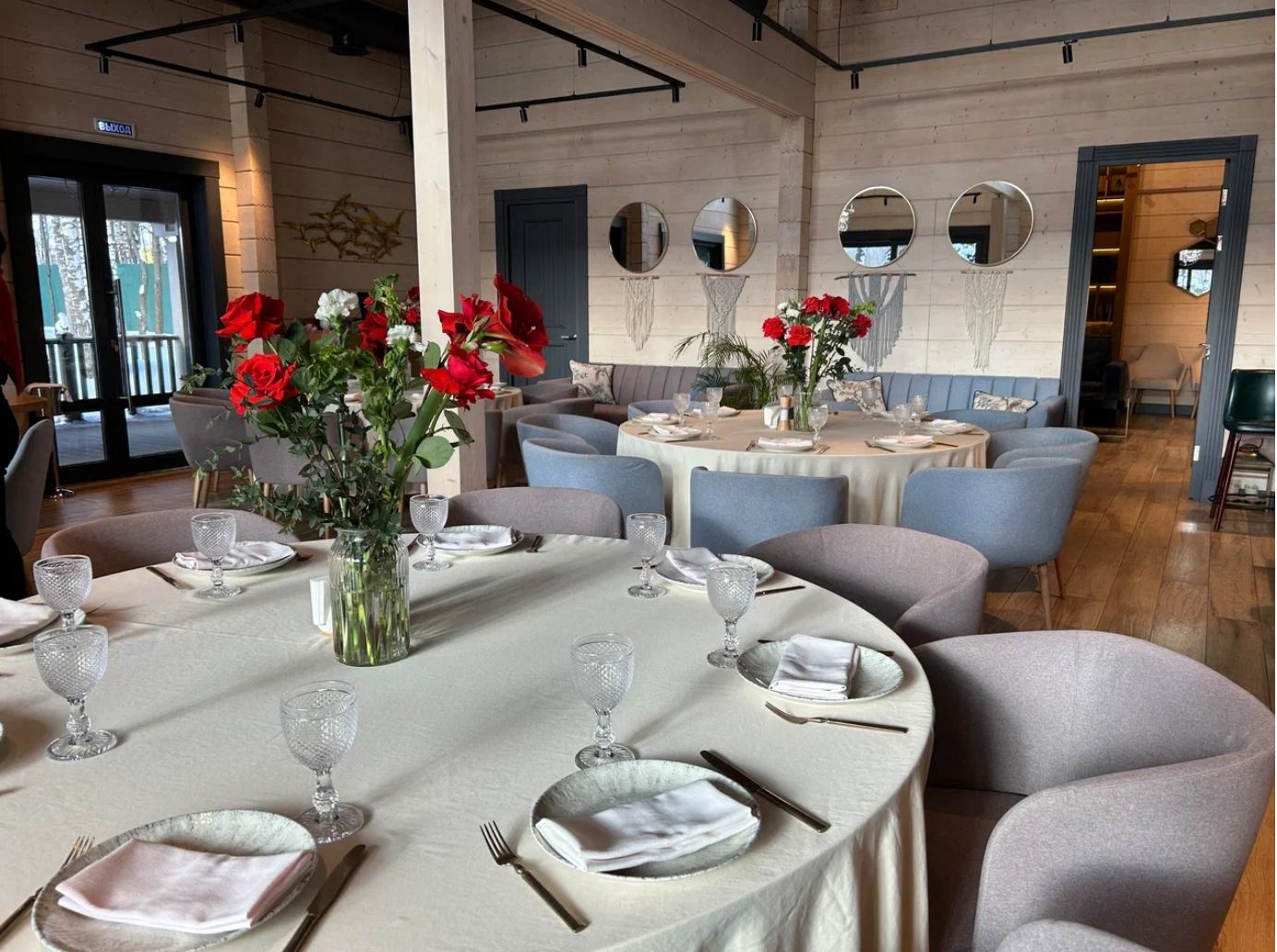 Ресторан с верандой и видом на лес, возможность проведения выездной церемонии на природе. Коттедж с бассейном и баней от 3-х часов.