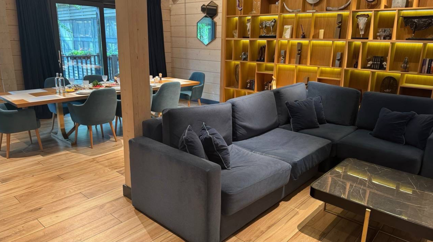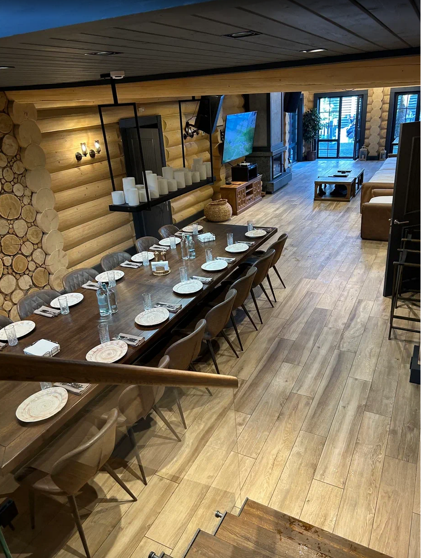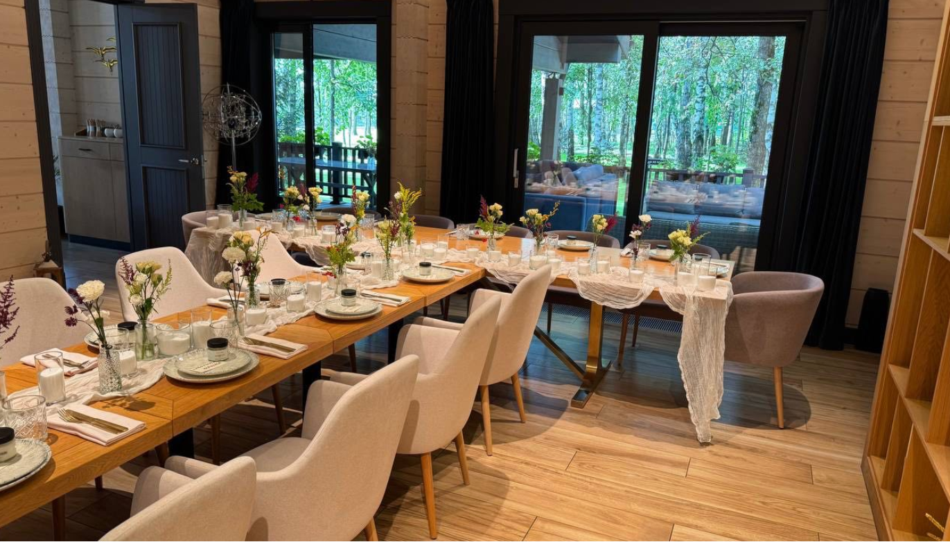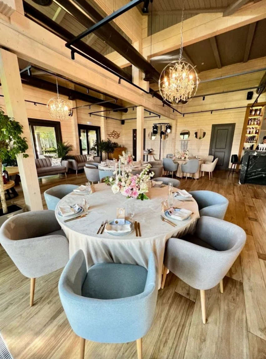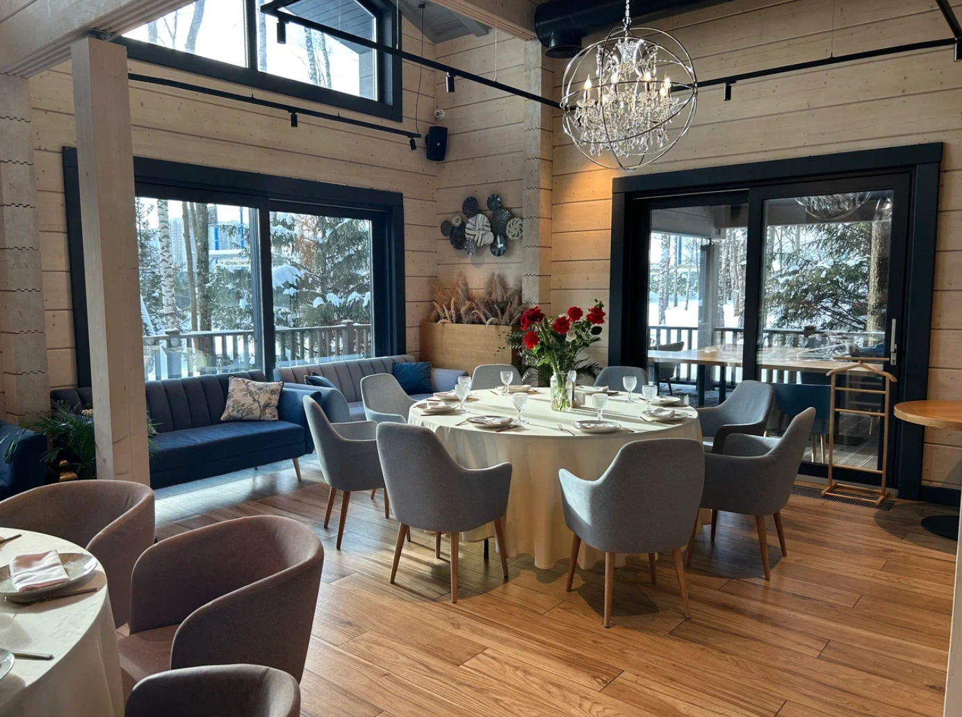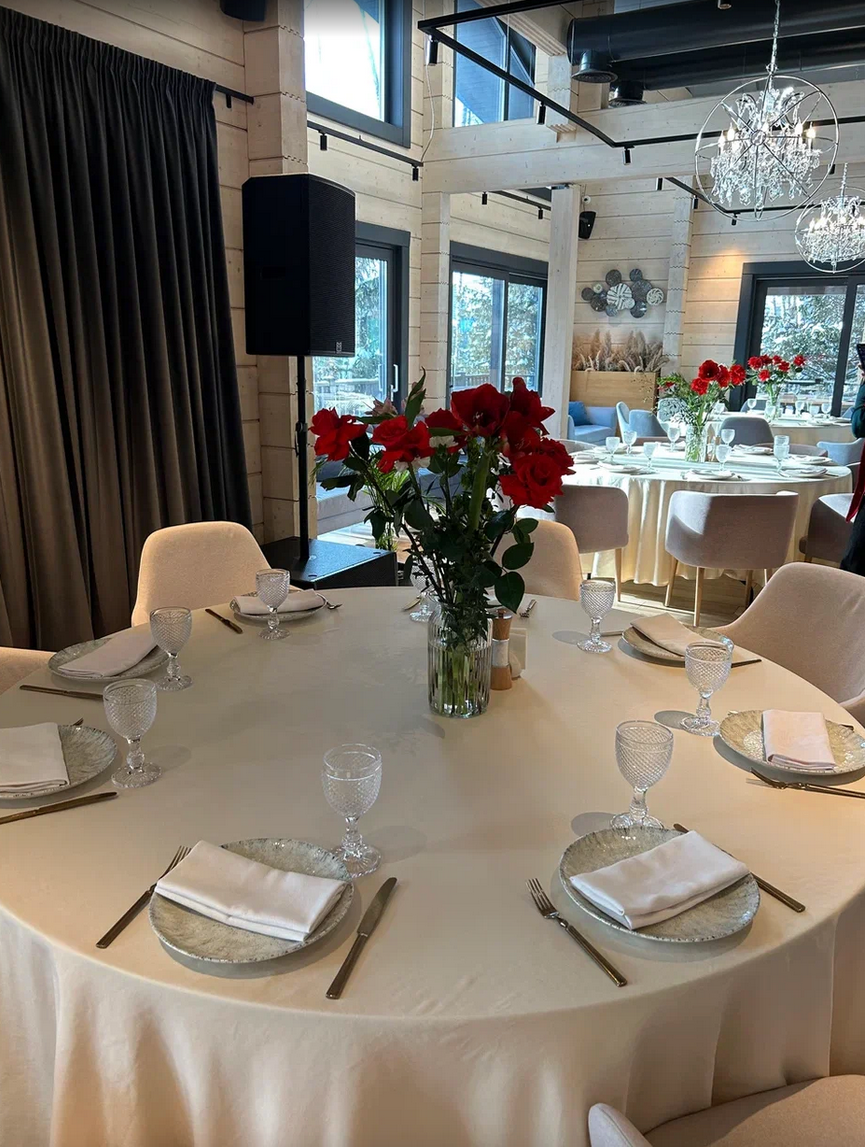 Ресторан с верандой и видом на лес, возможность проведения выездной церемонии на природе. Коттедж с бассейном и баней от 3-х часов.